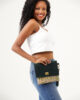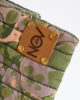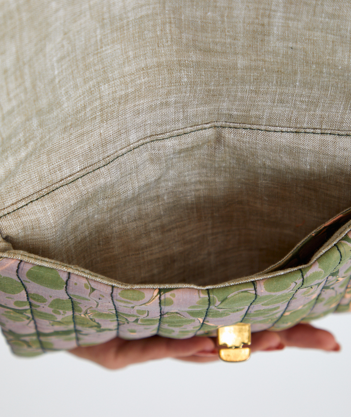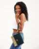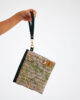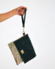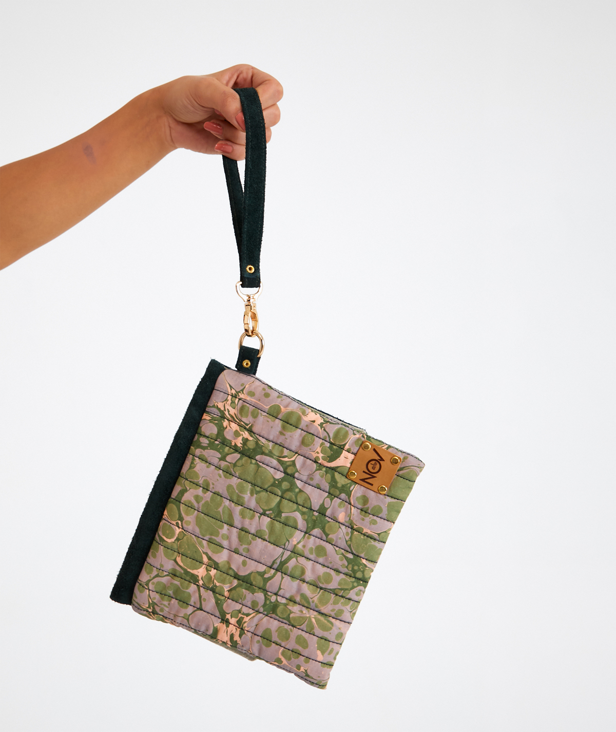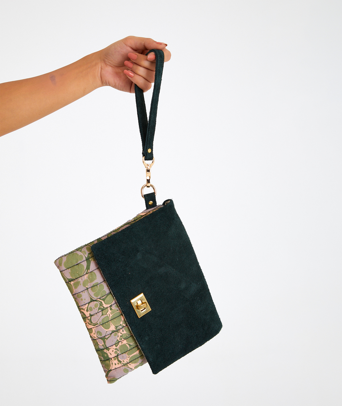 It is lined with cotton and consists of a single pocket. The flap is made of suede leather, while the back and the underside of the flap are entirely made of marbled fabric. It is completed with a metal accessory and a wrist strap. Preferred by women who appreciate simple elegance, this model stands out with its dominant green colors.